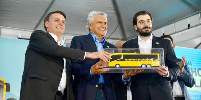 Em sua sexta vinda a Goiás em 10 meses como presidente da República, Jair Bolsonaro entregou, ao lado do governador Ronaldo Caiado, 214 ônibus do transporte escolar para a rede de ensino goiana. O evento foi realizado nesta sexta-feira (8/11), no pátio do estádio Serra Dourada. A nova frota vai beneficiar cerca de 15 mil estudantes de 133 municípios, em especial aqueles oriundos da zona rural. “Esse momento tem seu simbolismo, estamos entregando os ônibus para possam acessar uma escola e ser educados”, disse Bolsonaro.