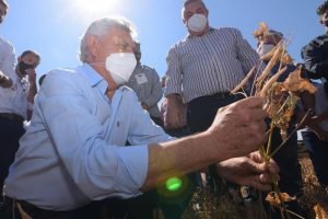O governador Ronaldo Caiado abriu, neste sábado (19/06), a colheita da safra 2020/2021 de feijão irrigado do Vale do Araguaia, na Fazenda Maria Helena, município de Jussara. “É uma produção altíssima na região, com tecnologia, aproveitamento de água de chuva e capacidade de intercalar com outros plantios, como soja e, em seguida, criação de gado”, afirmou.