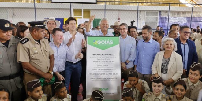 Com o objetivo de dar fim ao atrasado modelo de escolas de placa em Goiás, o governo estadual entregou mais uma unidade de ensino, desta vez em Águas Lindas, no Entorno do Distrito Federal. Nesta quarta-feira (29/1), o governador Ronaldo Caiado descerrou a placa de inauguração do Colégio Estadual da Polícia Militar (CEPMG) do município, um prédio moderno e seguro, que substitui uma estrutura antiga, feita de cimento pré-fabricado. O investimento é de R$ 3 milhões.