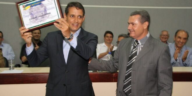 A Câmara Municipal de Uruaçu entregou na noite de quinta-feira (24), em Sessão Solene, Título de Cidadão e Placa de Honra ao Mérito a pessoas que tiveram seus serviços prestados reconhecidos pela câmara. A solenidade foi presidida pelo vereador Roberto Tavares, o Amigo 10 (PSD), onde homenageou com Título de Cidadão a cinco novos cidadãos uruaçuenses. A lei concedeu o título ao deputado federal Thiago Peixoto (PSD); ao presidente da Agetop, Jaime Eduardo Rincón (representado pelo diretor de obras da Agetop, José Marcos de Freitas Musse); ao pastor Jeronimo Francisco Duarte; ao comandante do 14º BPM, Major Maxwell Franco de Moraes e ao secretário Municipal de turismo, Rubens Alencar Moreira.