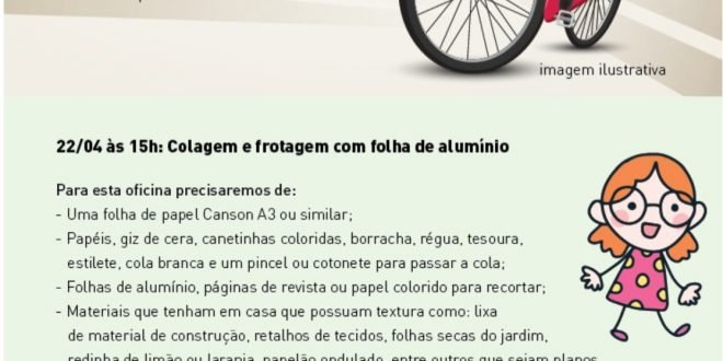 A oficina “Colagem e frotagem com folha de Alumínio” acontece no dia 22/04 e, para ela, será preciso: folhas de alumínio, folha de papel A3 e outros papéis, giz de cera, canetinhas coloridas, borracha, régua, tesoura, estilete, cola branca, pincel ou cotonete, páginas de revista ou papel colorido e outros materiais que possuam textura, como retalhos de tecidos, folhas secas do jardim, papelão ondulado, etc. Para participar, basta clicar no link: https://bit.ly/CCAL_oficina_colagem