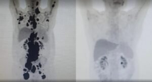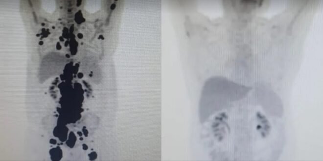 As duas imagens do Pet Scan (tomografia feita com um contraste especial) (veja acima) representam “dois Paulos”: a da esquerda, o paciente que tinha como caminho único os cuidados paliativos, quando a alternativa é dar conforto, mas já sem expectativa de cura, e a da direita, um paciente com um organismo já sem tumores após o tratamento com CAR-T Cell.