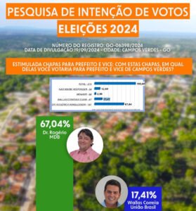 A pesquisa foi realizada no dia 17 de setembro, com 270 eleitores de Campos Verdes, e registrada junto ao Tribunal Regional Eleitoral (TRE) sob o número GO-06398/2024. Além das intenções de voto, o levantamento também avaliou a gestão de Haroldo Naves, que obteve 78,52% de aprovação, com as classificações de ótimo e bom. Apenas 8,8% consideraram a gestão regular, e 12,5% não souberam opinar.