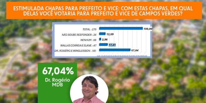 A mais recente pesquisa eleitoral do Instituto Criativa Consultoria confirma a liderança disparada do candidato Dr. Rogério Queiroz na corrida pela Prefeitura de Campos Verdes. Faltando pouco mais de duas semanas para as eleições municipais, o médico e seu vice, Wingleisson Araújo, registram 67,04% das intenções de voto, contra 17,41% de Wallas Correia, o principal adversário da oposição.