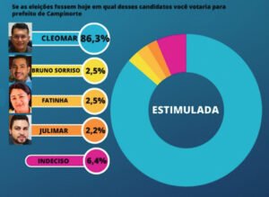Pesquisa eleitoral divulgada no dia, 21 de julho, aponta Cleomar liderando com folga a intenção de votos para prefeito de Campinorte com 86,3%, neste primeiro cenário foi testado junto com o nome de três pré-candidatos da oposição pelo PL, que apareceram tecnicamente empatados, Bruno Sorriso e Fatinha da Soberana pontuaram 2,5%, enquanto Julimar Caetano pontuou 2,2% das intenções de votos, 6,4% dos entrevistados declararam estar indeciso.