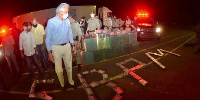 A partir da troca de informações, polícias Militar e Rodoviária Federal abordam carreta que transportava mais de 400 quilos da droga. Em visita ao município, governador fez questão de cumprimentar agentes. “Nós temos os melhores profissionais do país”, disse