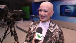 “Hoje é um dia realmente muito especial para mim. A TBC é minha casa, me sinto feliz de ter recebido esse convite para apresentar o jornal hoje”, disse. Ela contou que está passando por uma luta pessoal, no tratamento do câncer. “Queria pedir licença para vocês, para poder representar aqui os pacientes que lutam com essa doença, que são julgados. Eu quero dizer que isso não é uma sentença de morte. Quando a gente recebe um diagnóstico de câncer, é uma luta pela vida”, afirmou emocionada.