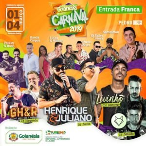 A Prefeitura de Goianésia por meio da Secretaria Municipal de Esportes, Juventude e Lazer divulgou oficialmente as atrações do Carnaval 2019, o anúncio foi feito pelo diretor de Comunicação, Thalles Moura, durante coletiva de imprensa realizada nesta terça-feira, 29 de Janeiro, juntamente com o secretário da Casa Civil, Manoel Arantes e do diretor de Eventos, Luiz Fernando.
