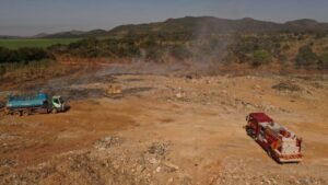 Permanecem no local dois caminhões pipa e uma escavadeira que realizam continuamente o revolvimento do material para extinção do incêndio.