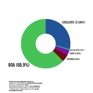 Segundo a pesquisa, que entrevistou 256 pessoas no dia 04 outubro, com uma margem de erro de 3,9% pontos percentuais para mais ou para menos e 95% de nível confiança, a aprovação massiva da gestão do prefeito Haroldo Naves reflete a satisfação da população com as obras e projetos em andamento no município. O prefeito, que também ocupa cargos de destaque em organizações municipais e nacionais, como a presidência da Federação Goiana de Municípios (FGM) e a vice-presidência da Confederação Nacional dos Municípios (CNM), demonstra um compromisso notável com o desenvolvimento de Campos Verdes.