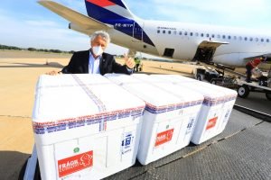 O governador Ronaldo Caiado recebeu, na manhã desta quinta-feira (29/04), no Aeroporto Internacional de Goiânia, mais 161,2 mil vacinas contra a Covid-19 enviadas pelo Ministério da Saúde. A nova remessa, de número 15, é formada por 158 mil doses do consórcio Oxford/AstraZeneca, produzidas pela Fundação Oswaldo Cruz (Fiocruz), e 3,2 mil da CoronaVac, fabricada pelo Instituto Butantan.