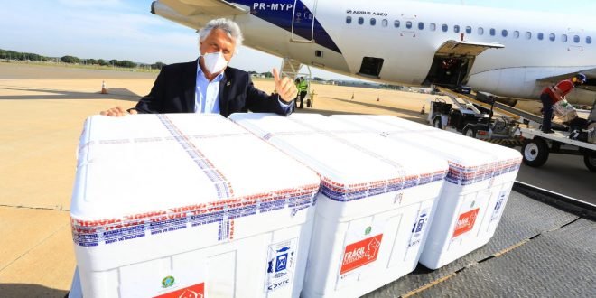 Lote é formado por 158 mil unidades da AstraZeneca, todas para primeira dose, e 3,2 mil da CoronaVac, das quais metade será reservada para reforço. “Esperamos, com esta remessa, atingir 100% dos cidadãos com 60 anos de idade”, afirma governador Ronaldo Caiado durante entrevista coletiva no Aeroporto Internacional de Goiânia