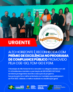 O Programa de Compliance Público Municipal (PCM) é uma iniciativa do Governo de Goiás, implementada pela Controladoria-Geral do Estado (CGE), em pareceria com o Tribunal de Contas dos Municípios do Estado de Goiás (TCMGO) e a Federação Goiana de Municípios (FGM). O Município de Alto Horizonte foi o vencedor na categoria cidades com até 10 mil habitantes. Contudo, sua pontuação foi a melhor entre todos os municípios que participaram do PCM 2023, obtendo o melhor resultado na classificação geral. Este reconhecimento destaca os esforços notáveis da administração municipal em promover a transparência, ética e gestão de riscos nas práticas governamentais.