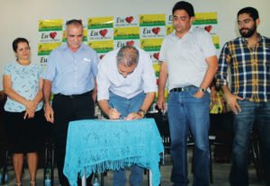 O prefeito Jacob Ferreira recebeu o vice-governador e sua comitiva no Centro Cultural do município e fez questão de reconhecer e agradecer os benefícios recebidos pelo Governo de Goiás. Esse convênio assinado aqui hoje, nós vamos aplicar 100% em asfalto, asfaltar a rua paralela a BR 153, até o Posto Tigrão, e dois setores que estão nascendo e vão receber o asfalto e aí sim, vamos construir as casas populares. Tivemos a alegria de receber nessa semana o crédito de 250 mil na conta da prefeitura, de um total de 500 mil para reforma e ampliação do hospital. Recebemos recurso para compra de duas ambulâncias no valor de 120 mil. Recebemos também através do cheque comunitário o valor de 30 mil do total de 90 mil para construção da Praça Pôr do Sol, outro cheque no valor de 30 mil do total de 100 mil para construção da pista de skate e 40 mil de um total de 170 mil para cobertura e reforma da quadra da Lavrinha. Antes nós havíamos recebidos uma emenda do deputado Nédio Leite para construção do Campo Soçaite, uma ambulância do deputado Hélio de Sousa, enfim, todos esses benefícios eu agradeço a Deus e todas as pessoas que estão me ajudando a governar essa cidade”, ressalta Jacob.