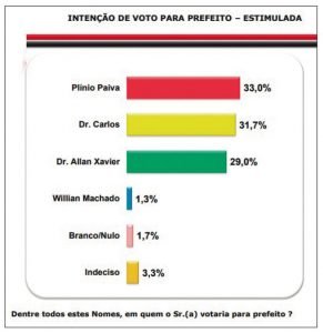 No levantamento espontâneo feito pela Podium, quando o eleitor diz livremente qual o candidato da sua preferência, sem observar cartelas contendo nomes, a liderança segue muda de lado e quem aparece na frente é o candidato Dr. Carlos, com 26% das intenções de votos. Plinio Paiva vem logo a seguir com 24,3% seguido do Dr. Allan que aparece com 22%. Willian Machado foi apontado por apenas 0,7%. Os que disseram estar indecisos foi de 23% e os que disseram nulo foi de 4%.
