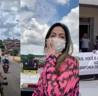Nas imagens, Laís aparece na parte de trás de uma caminhonete equipada com autofalante. De conjunto rosa choque e máscara, a sister foi transportada pela rua principal da cidade com algumas dezenas de carros e motos atrás, seguindo.