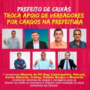 Se há algo que o município de Crixás parece cada vez mais com o Brasil é na quantidade de escândalos envolvendo políticos e o uso da máquina pública para beneficio financeiro de parentes e aliados políticos. Nos primeiros meses de 2022, o prefeito Carlos Seixo e seu vice-Tiago Dietz promoveram uma verdadeira negociata que envolveu pelo menos 7 vereadores (Maurim do Pit Dog, Camarguinho, Patryck, Carlos Eduardo, Crisley, Cláudio Borges e Romário que receberam dezenas de cargos e vantagens para se aliarem ao chefe do executivo e votarem pela reeleição do atual presidente da Câmara, Maurinho do Pit Dog, que também tem repetido de forma sistemática a antiga prática política de troca de cargos por apoio.