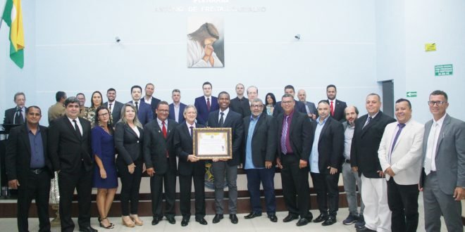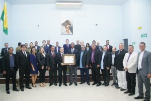 O presidente do Tribunal de Justiça do Estado de Goiás (TJGO), desembargador Walter Carlos Lemes, recebeu, na noite desta quinta-feira (13), o título de Cidadão Uruaçuense. A sessão solene aconteceu na Câmara Municipal de Uruaçu e o título foi entregue pelo presidente da Casa de Leis, Antônio de Sousa Reis, o Taroba, acompanhado pelos demais vereadores que votaram a propositura do título por unanimidade.