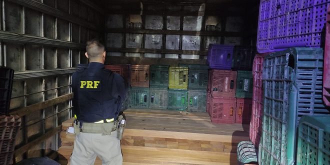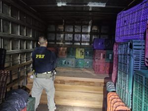 Ao fiscalizar o veículo, os policiais encontraram uma carga de madeira escondida debaixo de caixas de verduras.
