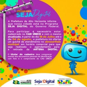 A Prefeitura de Alto Horizonte informa que o município está no Programa SEJA DIGITAL do Governo Federal. Para participar é necessário estar cadastrado no CAD ÚNICO atualizado. A partir do dia 18 de julho até o dia 04 de agosto, a prefeitura irá ofertar um guichê de atendimento no almoxarifado municipal em horário comercial para que seja realizado o agendamento para a retirada da Antena Digital. O titular do cadastro deve comparecer munido dos documentos pessoais de identificação com foto e o comprovante do CAD ÚNICO.