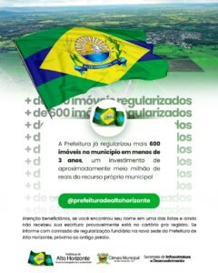 A Prefeitura de Alto Horizonte através do programa de Regularização Fundiária, já regularizou mais 600 imóveis no município em menos de 3 anos, um investimento de aproximadamente meio milhão de reais do recurso próprio municipal, que contribui para o desenvolvimento organizado, legal e sustentável da cidade.