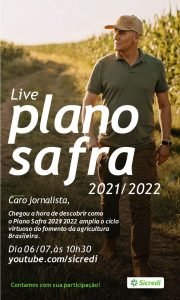 O Sicredi, instituição financeira cooperativa com mais de 5 milhões de associados, realizará um evento on-line para o lançamento do Plano Safra 2021/2022. A live, que contará com a participação da Ministra da Agricultura, Pecuária e Abastecimento, Tereza Cristina, é aberta ao público e será realizada no dia 06 de julho, às 10h30, com transmissão pela página do YouTube da instituição financeira: www.youtube.com/sicredi.