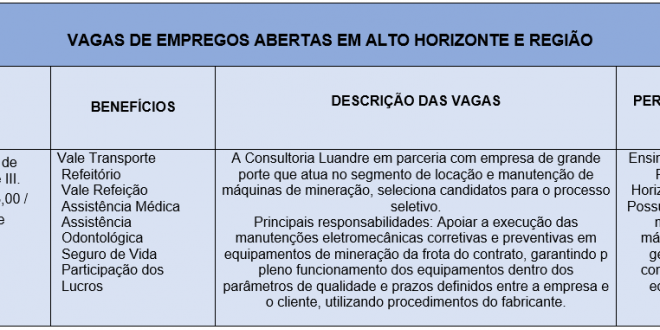 A Consultoria Luandre em parceria com empresa de grande porte que atua no segmento de locação e manutenção de máquinas de mineração, seleciona candidatos para o processo seletivo.